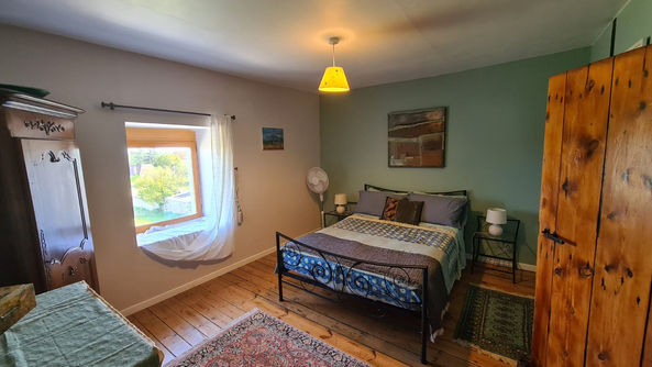 This popular bedroom is the largest of the three bedrooms on the top floor, with a double bed, chest of drawers and small wardrobe. Cool, calming green décor combined with tasteful landscape paintings and natural wood blend seamlessly into the view across the fields from the front of the house.